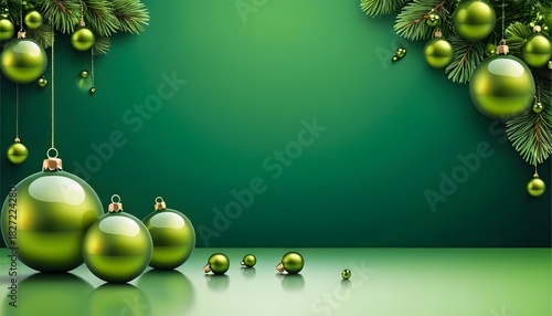 Obraz premium Festive Green Christmas Ornaments and Pine Needles Adorn a Shiny Surface,...