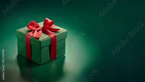 Fototapeta premium Festive green velvet box with red satin bow, dark bokeh background, elegant look