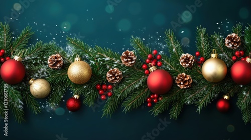 © OnuTH, Naklejka premium Festive Greenery with Ornaments, Berries, and Pine Cones for Holidays
