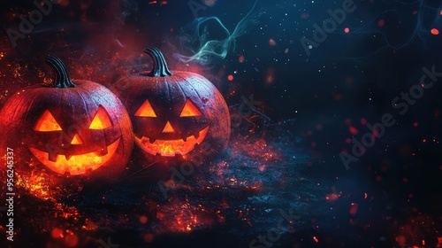 © Tunsale, Naklejka premium Festive Halloween Banner with Pumpkins and Dark Glowing Background. AI generated illustration