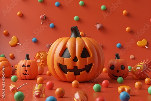 Fototapeta premium Festive Halloween Scene with Colorful Pumpkins and Candy