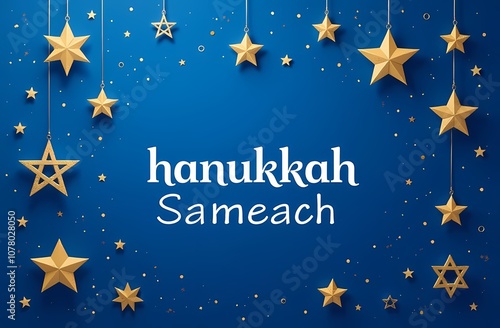 © Kseniia, Naklejka premium Festive Hanukkah card. gold Stars of David on blue background. The text "Hanukkah Sameach"