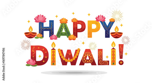 © Awan, Fototapeta premium Festive Happy Diwali Celebration Design with Decorative Elements and Vibrant Colors for Greeting Card or Banner Happy Diwali Celebration Design