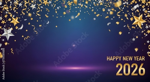 © MdRaihan, Obraz premium Festive Happy New Year 2026 Celebration with Gold Confetti and Starry Decorations Elegant Design for Holiday Greetings and Joyful Occasions with Sparkling Elements Backdrop