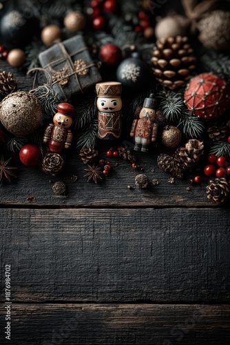 © Georgii, Obraz premium Festive holiday background featuring nutcrackers, pinecones, and seasonal decorations on wood