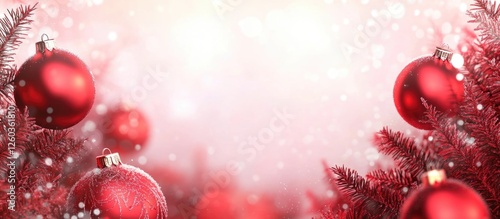 Fototapeta premium Festive holiday background featuring shimmering red baubles hanging from snowy fir branches with a dreamy soft-focus effect