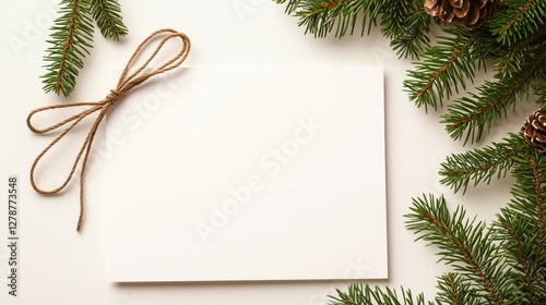 © Adisorn, Obraz premium Festive Holiday Card with Pine Branches and Twine Bow on White Background