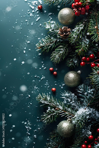 © Golib Tolibov, Naklejka premium Festive Holiday Cheer With Spruce, Bells, and Snow
