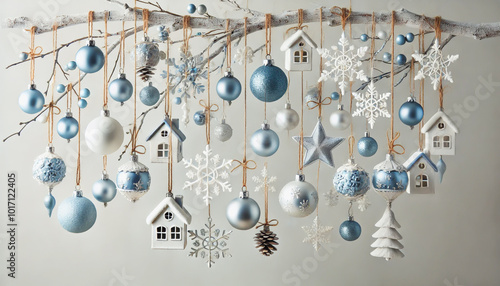 Obraz premium Festive holiday decor with baubles, snowflakes, and charming house ornaments.