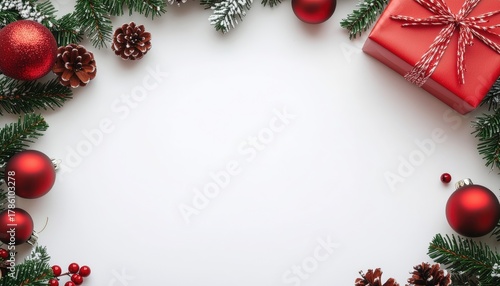 Obraz premium Festive holiday decoration with red ornaments and gift box christmas theme...
