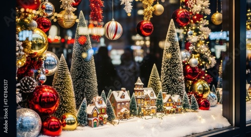© IbragimovN, Naklejka premium Festive holiday display of miniature village with christmas trees and colorful ornaments