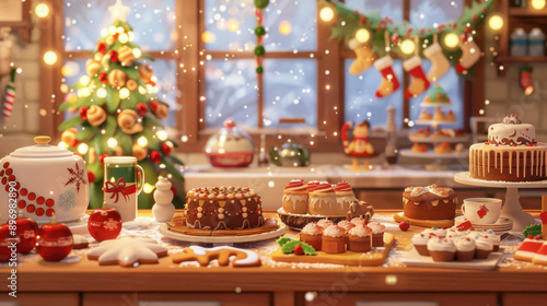 © M, Naklejka premium Festive holiday display with decorated cakes, cookies, and a Christmas tree in a cozy kitchen setting