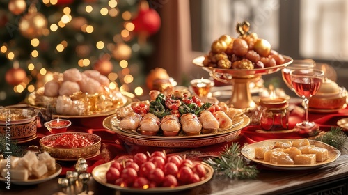 © kvladimirv, Fototapeta premium Festive Holiday Feast with Ornament Decorations and Gourmet Dishes on Table