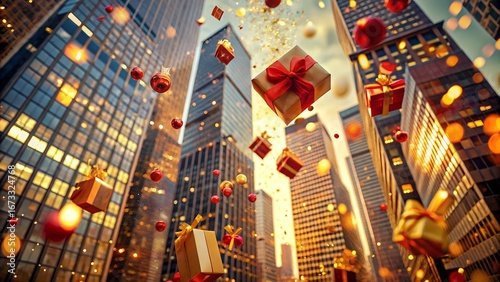 © AKASH, Obraz premium Festive Holiday Season Gifts Floating in a Cityscape with Skyscrapers
