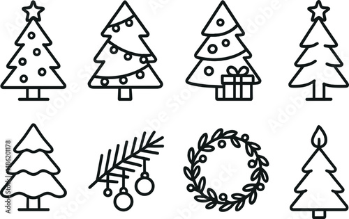 Fototapeta premium Festive holiday trees outline icons set – simple, christmas and decoration...