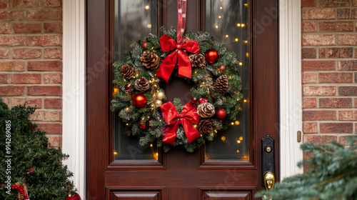Naklejka premium Festive Holiday Wreath Adorned With Pinecones and Bows Hanging on Front Door...