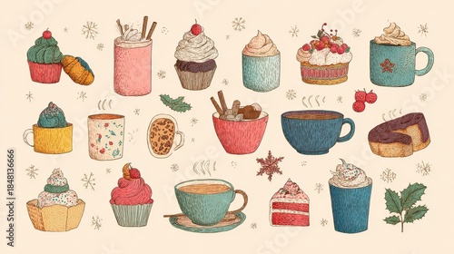 Fototapeta premium Festive illustration featuring an assortment of treats cupcakes, muffins, cake slices, and hot drinks. Delicate snowflakes and accents are scattered