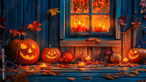 Obraz premium Festive Jack-o'-Lanterns with Candles and Autumn Leaves by Window