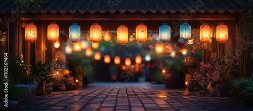 Obraz premium Festive lanterns illuminate a cobblestone pathway in front of a traditional...
