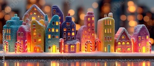 Naklejka premium Festive Lit Ceramic Houses on Reflective Surface