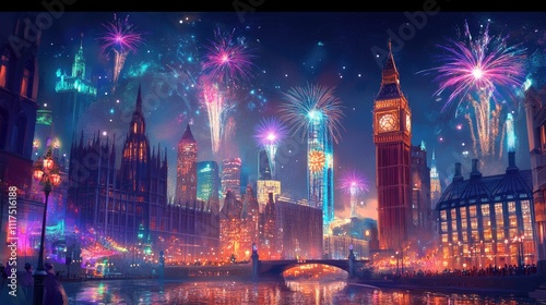 © adibaatmarini, Fototapeta premium Festive London cityscape at night with fireworks reflecting on water.