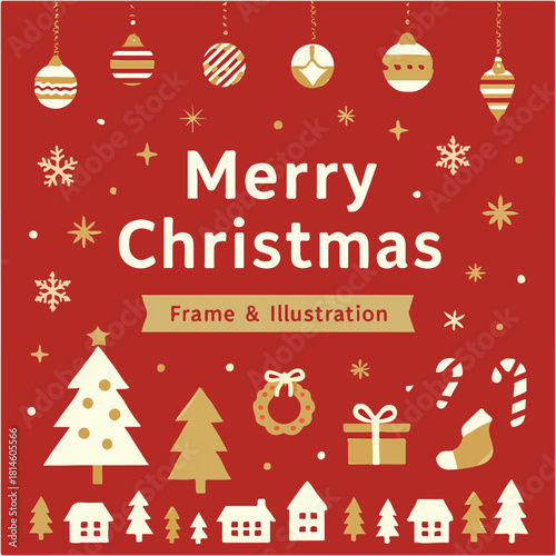 Fototapeta premium Festive merry christmas greeting card elements featuring ornaments trees gifts and snowflakes on red background