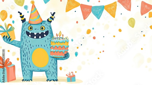 Naklejka premium Festive monster holding cake & gifts, birthday party background, celebration banner design