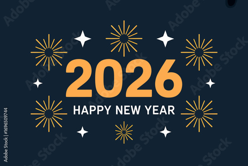 © NUSRAT, Fototapeta premium Festive 2026 New Year's Celebration Banner with Sparkling Stars and Elegant Typography on Dark Blue Backdrop