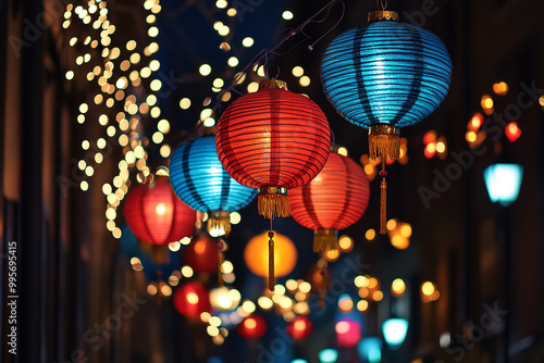 Fototapeta premium Festive Night in Beijing with Fusion of Chinese Lanterns and Christmas Lights