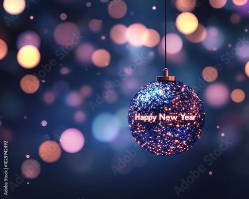 Fototapeta premium Festive ornament with 'Happy New Year' inscription against a dreamy, bokeh...