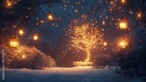 © wicha, Naklejka premium festive outdoor Christmas background with a glowing tree surrounded by snowy bushes and lit by vintage lanterns.
