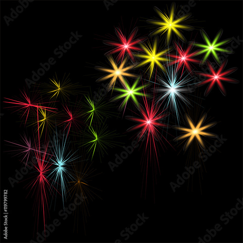© lily_studio, Naklejka premium Festive patterned firework bursting in various shapes sparkling pictograms set against black background abstract isolated illustration