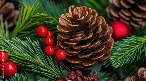 Fototapeta premium Festive pine cone, holly berries, and evergreen wreath detail, Christmas card design
