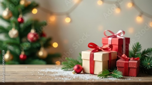 Obraz premium Festive Presents on Wooden Table with Decorated Christmas Tree in Soft Focus Background