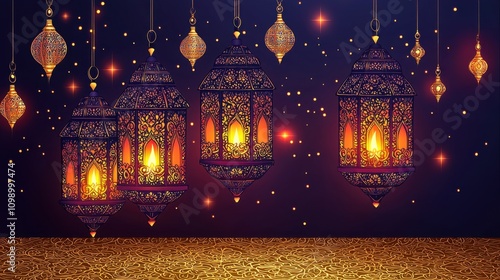 Obraz premium Festive Ramadan Lanterns Islamic Arabic Hanging Lights Celebration Background...