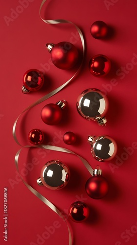 © Designer, Fototapeta premium Festive Red and Gold Christmas Ornaments with Ribbon