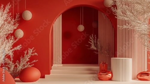 Fototapeta premium Festive Red Archway Product Display Mockup with Golden Accents