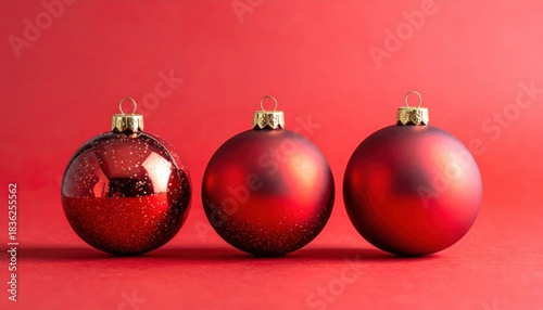 Fototapeta premium Festive red Christmas ornaments sparkle against a bright red backdrop,...