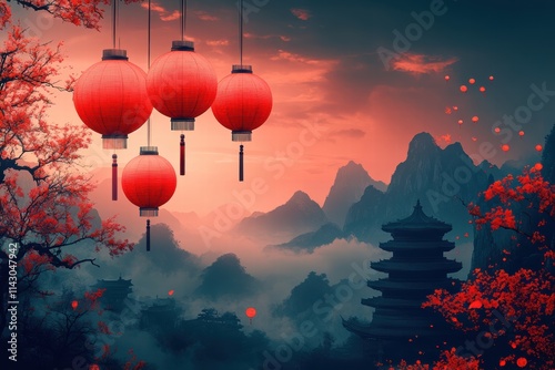 © Bojan, Obraz premium Festive red lanterns illuminated against a serene mountain backdrop during Chinese New Year celebration