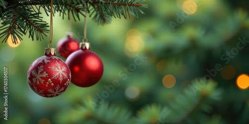© Cherrisa, Obraz premium Festive red ornaments hanging from a Christmas tree branch with a blurred green background.