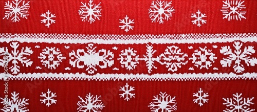 Obraz premium Festive red sweater pattern with white snowflakes ideal for holiday promotions and gift packaging copy space for messages or greetings