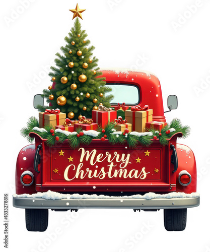Obraz premium Festive red vintage pickup truck overflowing with christmas tree, gifts, and garland, celebrating the holiday spirit isolated on transparent background