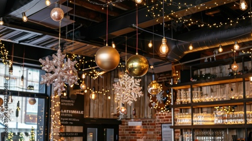 Obraz premium Festive restaurant interior with hanging ornaments, lights, and snowflakes.