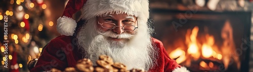 © Tin, Obraz premium Festive Santa Claus smiling by the fireplace, surrounded by Christmas decorations, perfect for holiday-themed projects.