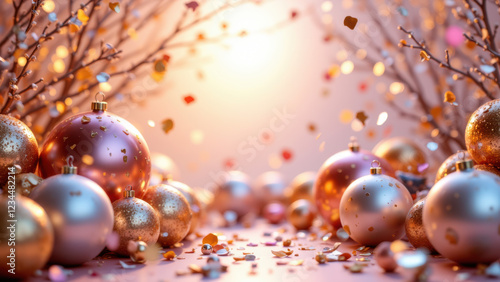 Fototapeta premium Festive scene with a path lined by Christmas ornaments, leading to warm light...