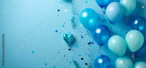 © Arif, Obraz premium Festive scene with blue balloons, heart-shaped confetti, and curling ribbons on a light blue background, creating a joyful celebration atmosphere.