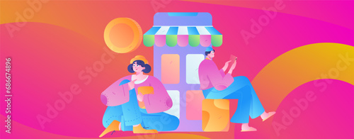 © Lyn Lee, Naklejka premium Festive Shopping E-Commerce Online Shopping People Flat Vector Concept Operation Hand Drawn Illustration