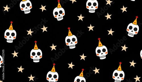 © jiale, Naklejka premium Festive Skulls with Party Hats on a Black Background with Stars