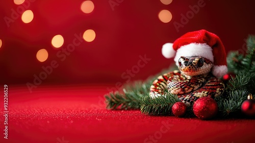 Obraz premium Festive Snake in Santa Hat with Christmas Decor and Red Bokeh Background