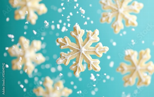 Fototapeta premium Festive snowflake-shaped cookies floating mid-air on a bright turquoise background